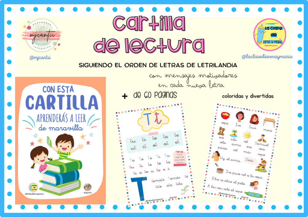 📖 CARTILLA DE LECTURA 📖 Cartilla de lectura 📖 atractiva, divertida, con mucho colorido y con mensajes motivadores en cada nueva letra. El orden de presentación de las letras es el mismo que emplea letrilandia, sirviendo asà perfectamente de material extra. Contiene más de 60 páginas listas para fotocopiar.